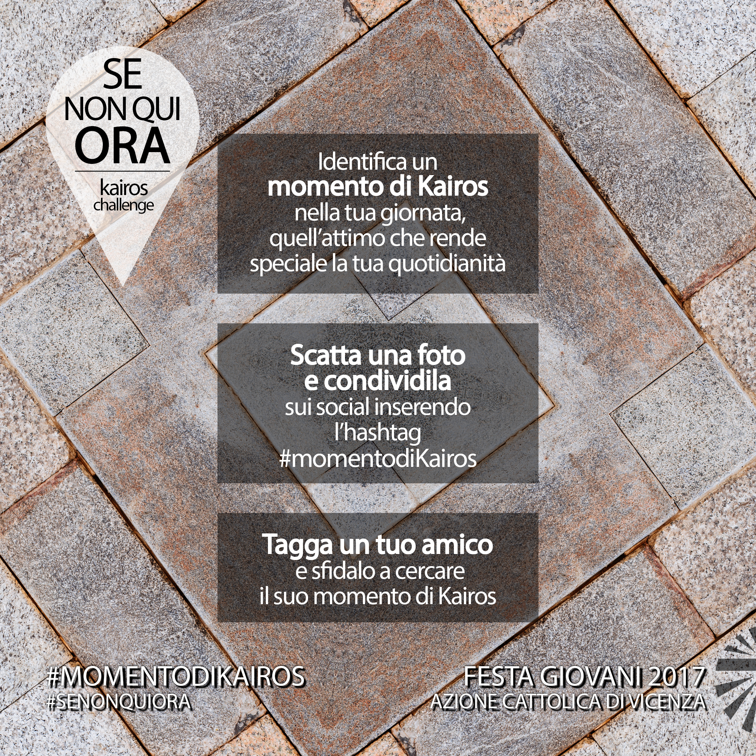 Mentre Chronos si riferisce al tempo cronologico e sequenziale, Kairos significa “un tempo nel mezzo”, un momento di un periodo, nel quale qualcosa di speciale accade. Il challenge continua con la condivisione sui social con gli hashtag #momentodikairos #senonquiora e #festagiovani2017, e un amico da taggare per sfidarlo a cercare il suo momento di kairos!